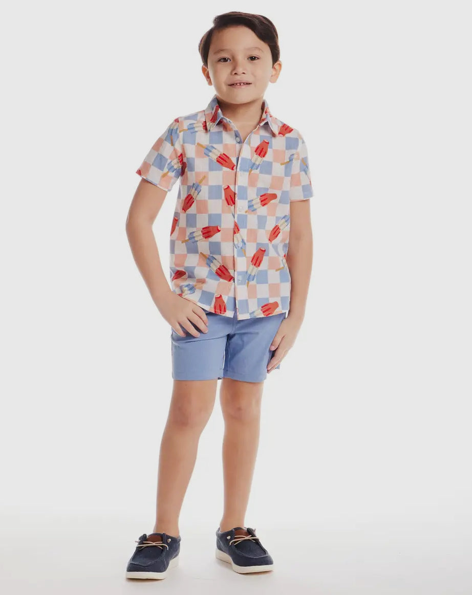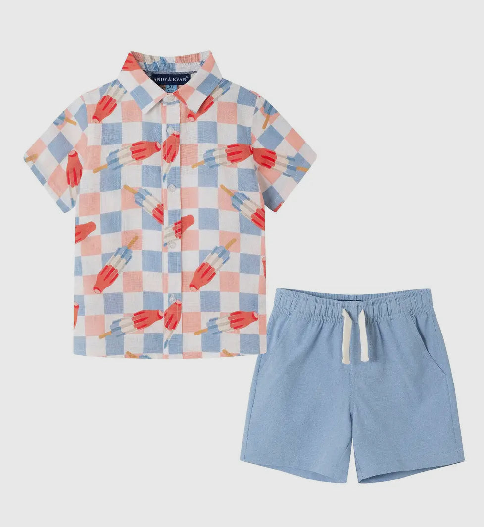 - Fun Popsicle Print: A playful checkered button-up shirt with a colorful popsicle design, paired with classic chambray shorts for a stylish summer vibe.